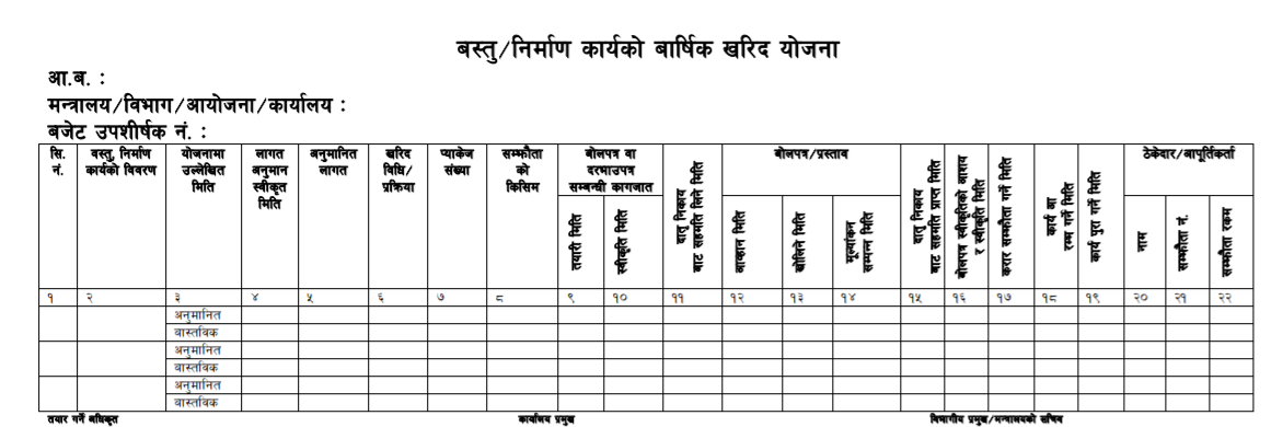कार्यालयले तोकेको छ । माल सामान खरिदको बार्षिक खरिद योजनाको फारामको ढाँचामा २२